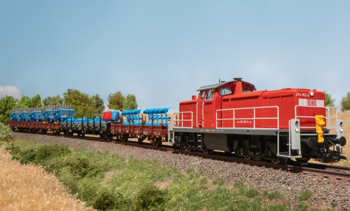 Exklusiv für mhi-Händler erscheint die BR 294 in aktuellen Zustand der Epoche VI. Das digitale Modell (Art. 39900) besitzt viele zusätzliche technische Raffinessen, wie zum Beispiel einen in Fahrtrichtung drehbaren Lokführer, beidseitige Telex-Kupplungen, Imitate der automatischen Kupplungen und viele Licht- und Geräuschfunktionen. Passend zur Lok werden zwei Güterwagensets angeboten die landwirtschaftliche Geräte transportieren.